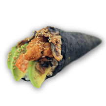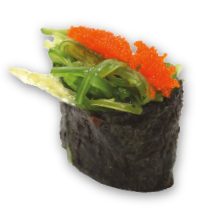 Salmón, arroz gohan, wakame, caviar, ajonjolí, wasabi (opcional)