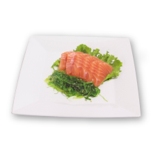 Salmón acompañado de wakame y salsa soya.