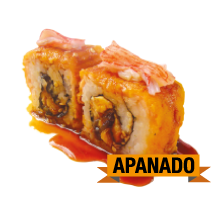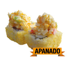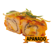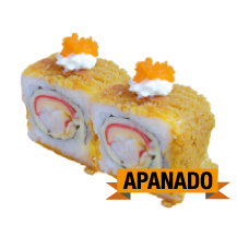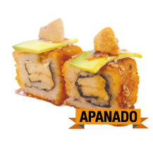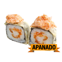 Palmito apanado, langostino precosido, aguacate, queso crema, zanahoria crispi.