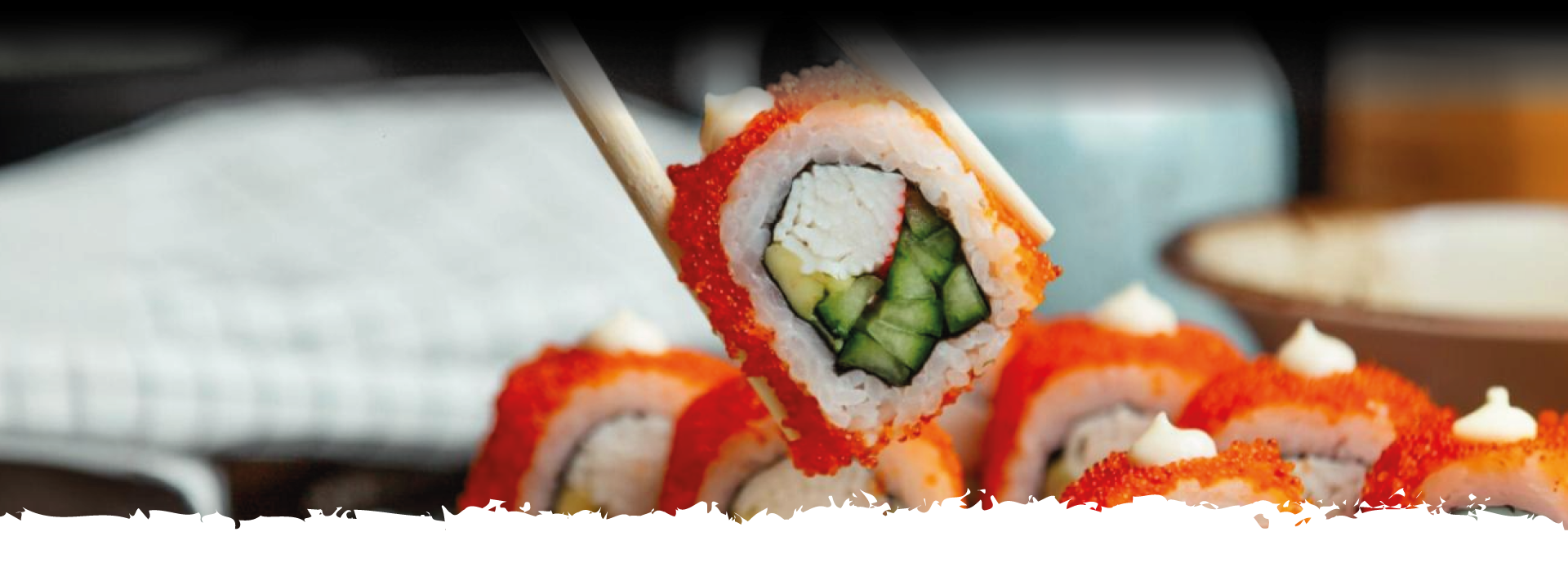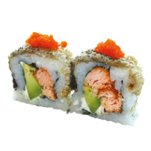 Salmón, anguila, kani, aguacate, ajonjolí, salsa especial, tempura, alga al borde.